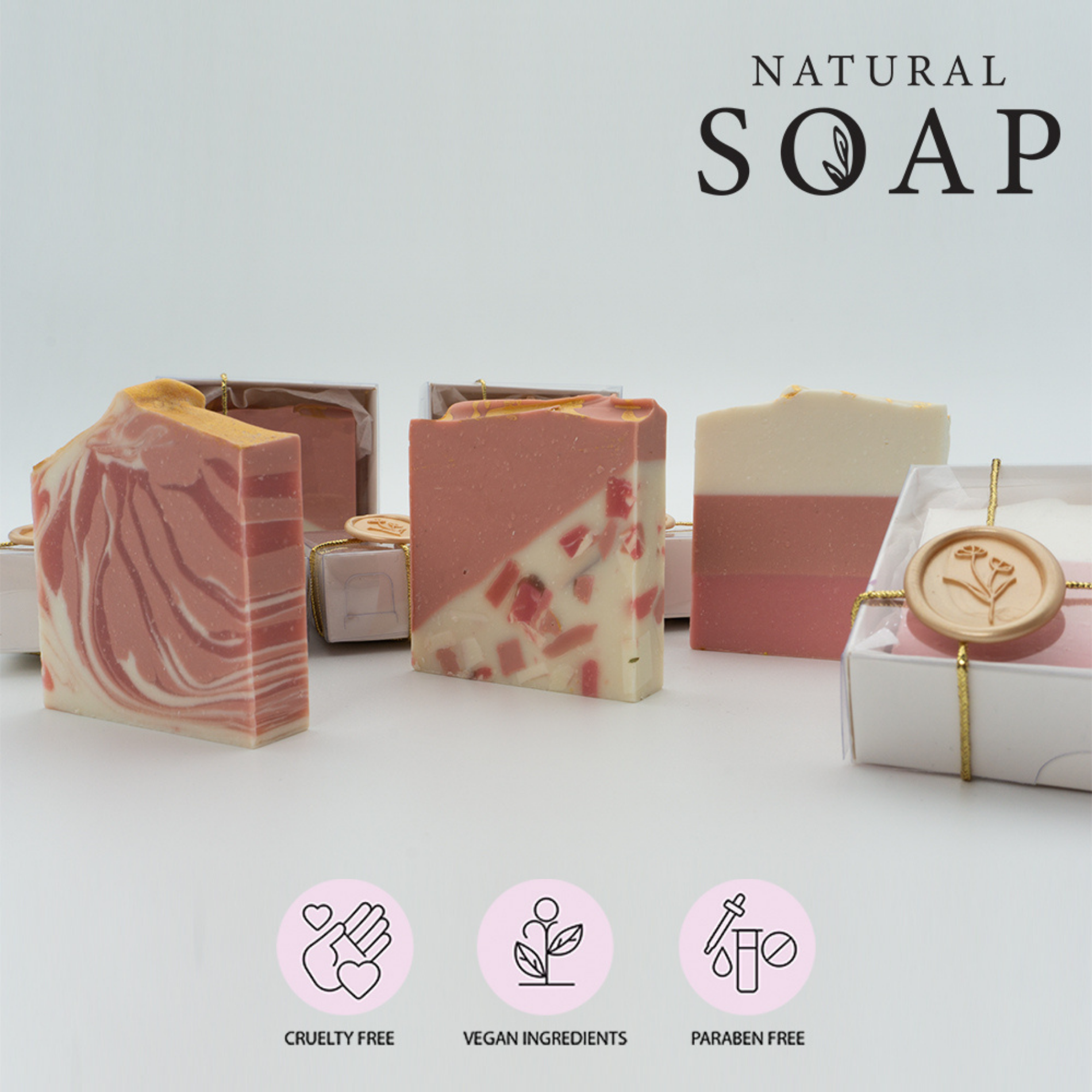 💫El yapımı üretim tekniğiyle her biri benzersiz desenlere ve pastel pembe tonlarına sahip bu sabunlar, banyonuza estetik bir dokunuş katarken aynı zamanda özel günlerde zarif bir hediye seçeneği sunar.