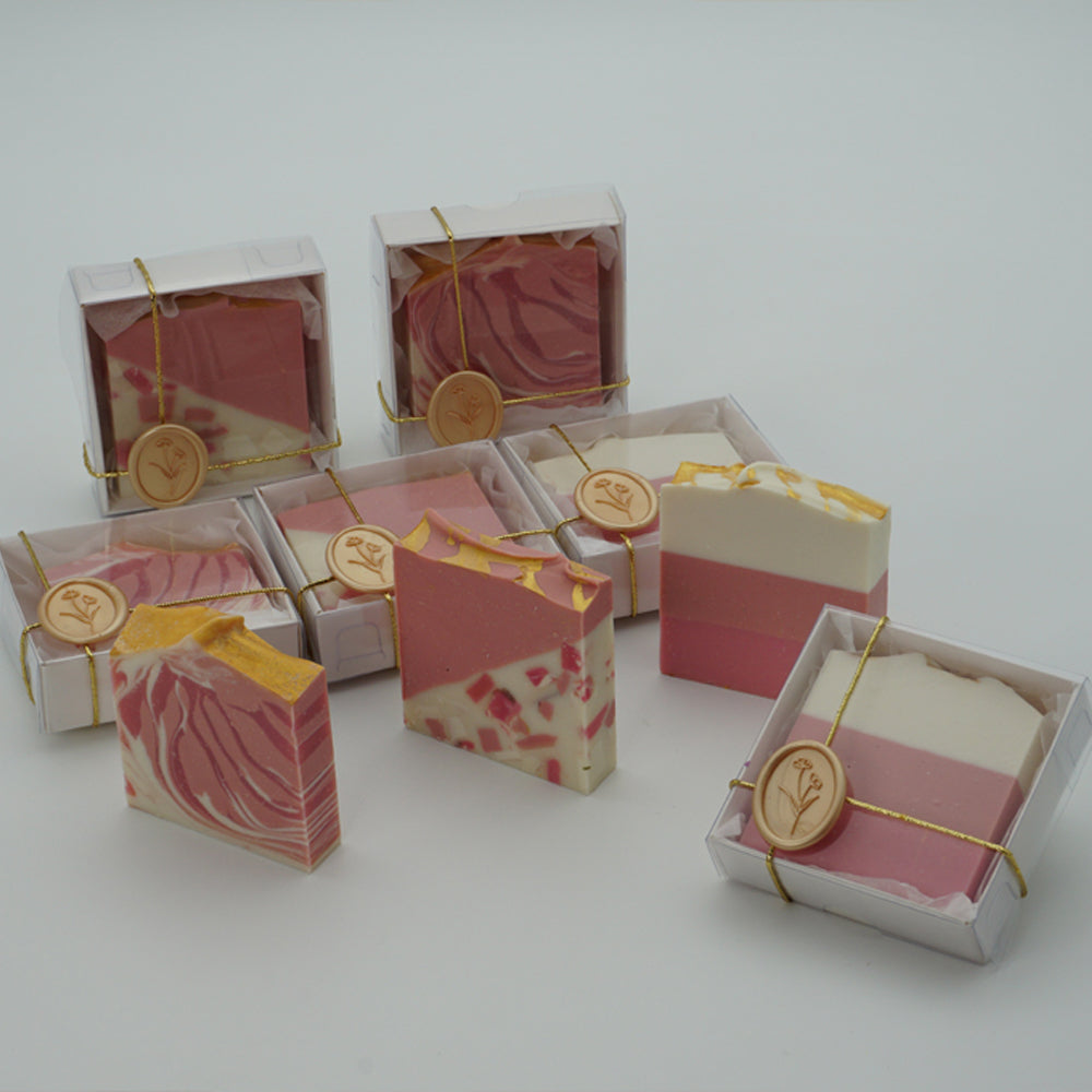 💫Mica ve oksit boyalar ile renklendirilmiş zarif pembe-beyaz katmanlar, sabuna görsel bir zarafet katar.
